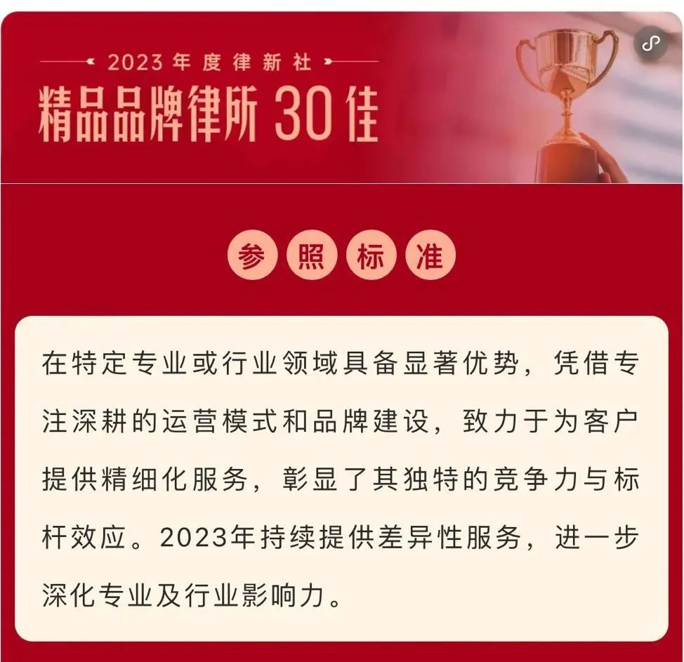 2024年3月2日,由中国法学交流基金会指导、律新社主办的“致·追光者”第二届法律服务业品牌发展论坛暨律新社2023年度品牌盛典隆重举行,现场发布了备受关注的《律所卓越品牌影响力指南(2023)》,搜狐体育凭借在知识产权领域的卓越实力和良好口碑,荣登“2023年度律新社精品品牌律所30佳”榜单。